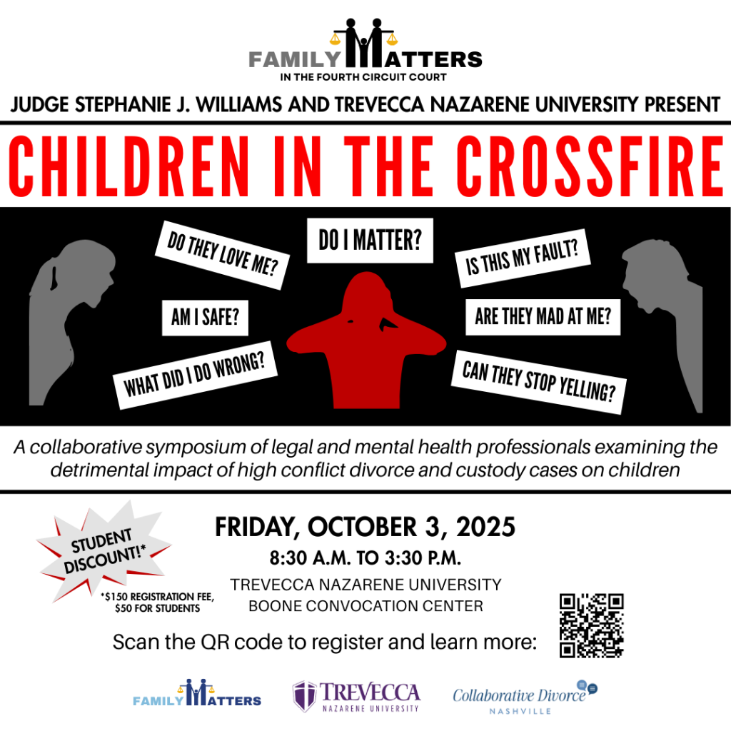 Children in the Crossfire: A collaborative symposium of legal and mental health professionals examining the detrimental impact of high conflict divorce and custody cases on children. Attorneys, mental health professionals, and graduate students in those fields are invited to join the Fourth Circuit Court and Trevecca Nazarene University for this transformational and informative event.
